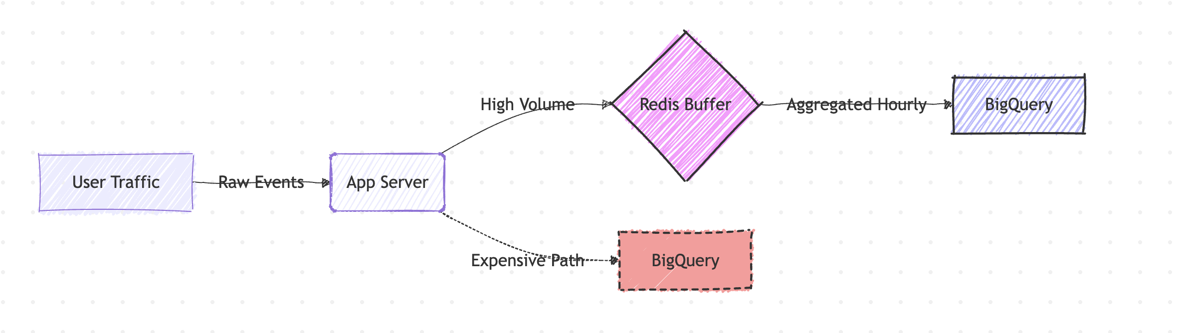 TIMESTAMPcuts query costs. - Don't stream raw events. Use Redis to aggregate data before inserting into BigQuery to save on query overhead.